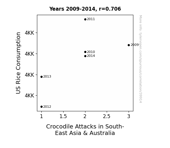 This means 49.9% of the change in the one variable (i.e., Crocodile Attacks in South-East Asia & Australia) is predictable based on the change in the other (i.e., US Rice Consumption) over the 6 years from 2009 through 2014.