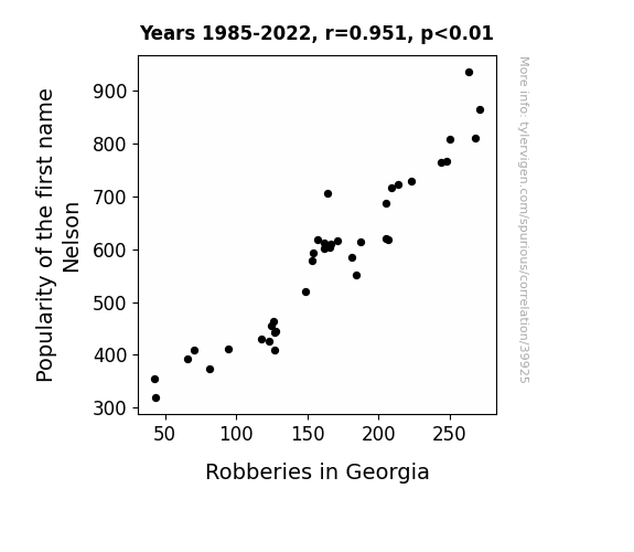 This means 90.4% of the change in the one variable (i.e., Robberies in Georgia) is predictable based on the change in the other (i.e., Popularity of the first name Nelson) over the 38 years from 1985 through 2022.