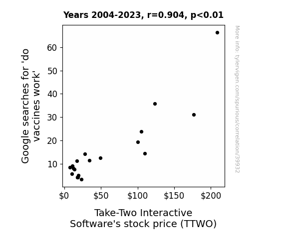 This means 81.7% of the change in the one variable (i.e., Take-Two Interactive Software's stock price (TTWO)) is predictable based on the change in the other (i.e., Google searches for 'do vaccines work') over the 20 years from 2004 through 2023.