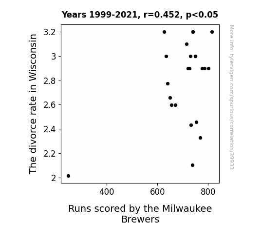 This means 20.4% of the change in the one variable (i.e., Runs scored by the Milwaukee Brewers) is predictable based on the change in the other (i.e., The divorce rate in Wisconsin) over the 23 years from 1999 through 2021.
