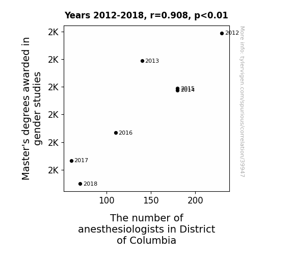 This means 82.5% of the change in the one variable (i.e., The number of anesthesiologists in District of Columbia) is predictable based on the change in the other (i.e., Master's degrees awarded in gender studies) over the 7 years from 2012 through 2018.