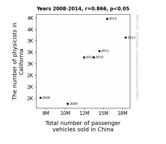 This means 74.9% of the change in the one variable (i.e., Total number of passenger vehicles sold in China) is predictable based on the change in the other (i.e., The number of physicists in California) over the 7 years from 2008 through 2014.