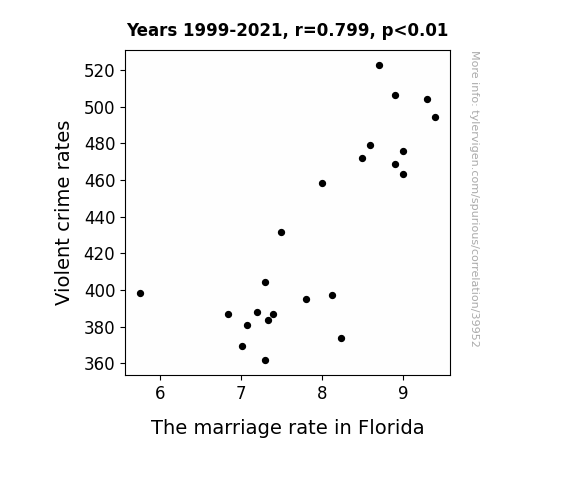 This means 63.8% of the change in the one variable (i.e., The marriage rate in Florida) is predictable based on the change in the other (i.e., Violent crime rates) over the 23 years from 1999 through 2021.