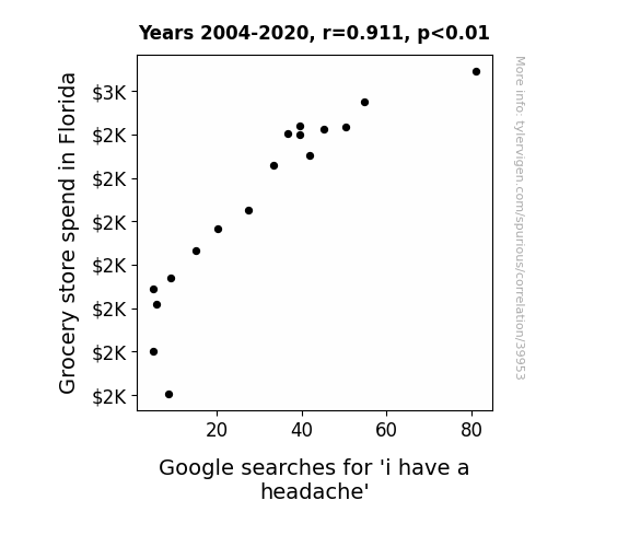 This means 83% of the change in the one variable (i.e., Google searches for 'i have a headache') is predictable based on the change in the other (i.e., Grocery store spend in Florida) over the 17 years from 2004 through 2020.