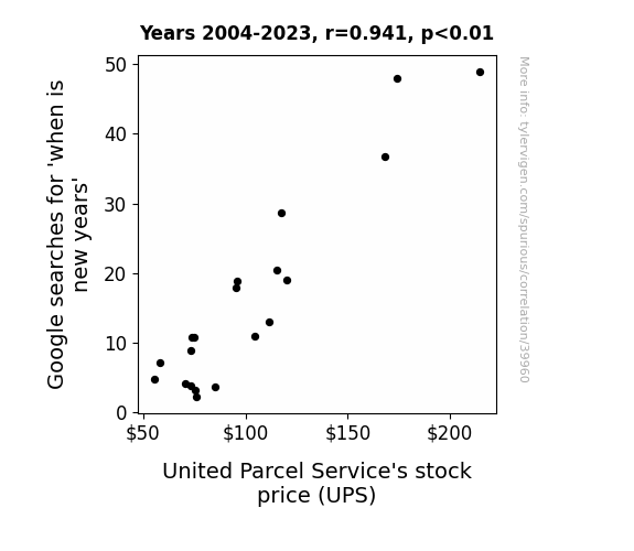 This means 88.5% of the change in the one variable (i.e., United Parcel Service's stock price (UPS)) is predictable based on the change in the other (i.e., Google searches for 'when is new years') over the 20 years from 2004 through 2023.