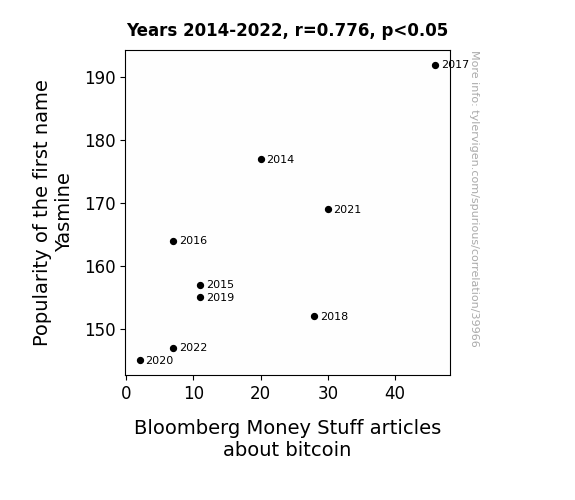 This means 60.3% of the change in the one variable (i.e., Bloomberg Money Stuff articles about bitcoin) is predictable based on the change in the other (i.e., Popularity of the first name Yasmine) over the 9 years from 2014 through 2022.