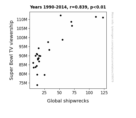This means 70.3% of the change in the one variable (i.e., Global shipwrecks ) is predictable based on the change in the other (i.e., Super Bowl TV viewership) over the 25 years from 1990 through 2014.