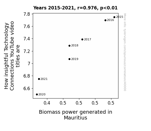 This means 95.3% of the change in the one variable (i.e., Biomass power generated in Mauritius) is predictable based on the change in the other (i.e., How insightful Technology Connections YouTube video titles are) over the 7 years from 2015 through 2021.
