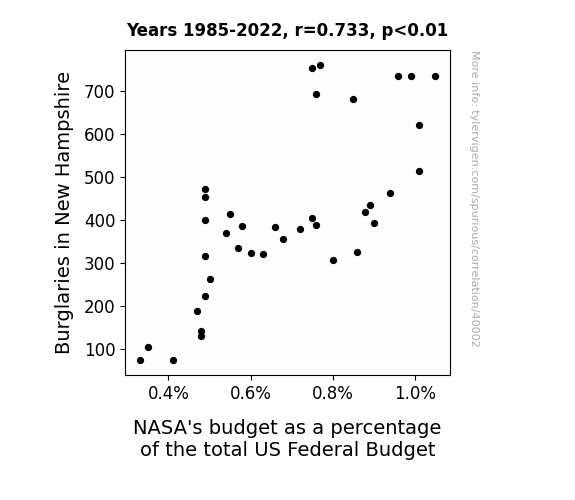 This means 53.8% of the change in the one variable (i.e., NASA's budget as a percentage of the total US Federal Budget) is predictable based on the change in the other (i.e., Burglaries in New Hampshire) over the 38 years from 1985 through 2022.