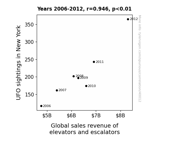 This means 89.5% of the change in the one variable (i.e., Global sales revenue of elevators and escalators) is predictable based on the change in the other (i.e., UFO sightings in New York) over the 7 years from 2006 through 2012.