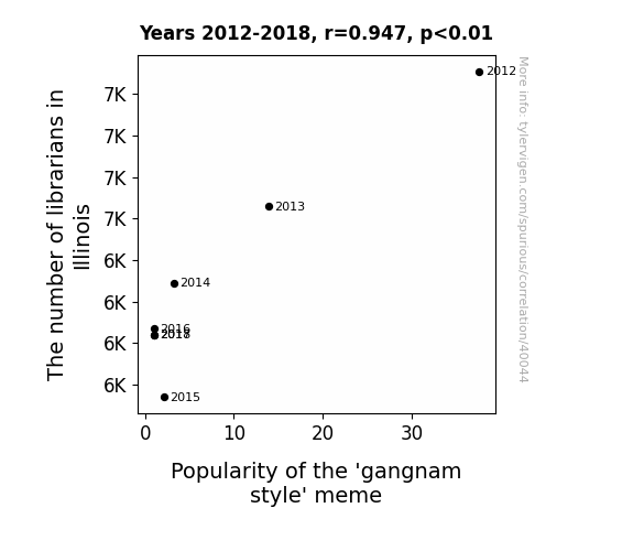 This means 89.7% of the change in the one variable (i.e., Popularity of the 'gangnam style' meme) is predictable based on the change in the other (i.e., The number of librarians in Illinois) over the 7 years from 2012 through 2018.