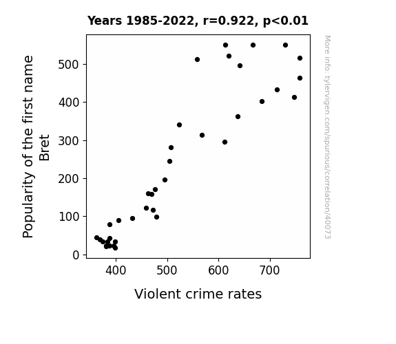 This means 84.9% of the change in the one variable (i.e., Violent crime rates) is predictable based on the change in the other (i.e., Popularity of the first name Bret) over the 38 years from 1985 through 2022.