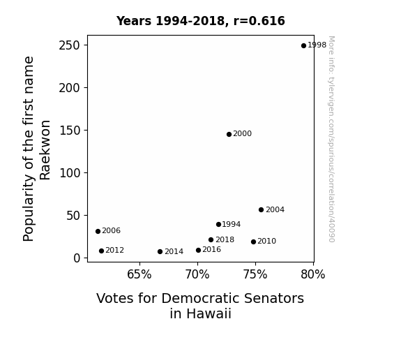 This means 38% of the change in the one variable (i.e., Votes for Democratic Senators in Hawaii) is predictable based on the change in the other (i.e., Popularity of the first name Raekwon) over the 10 years from 1994 through 2018.