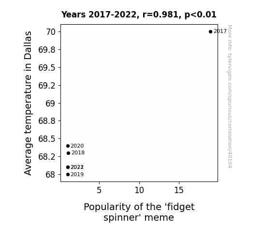 This means 96.3% of the change in the one variable (i.e., Popularity of the 'fidget spinner' meme) is predictable based on the change in the other (i.e., Average temperature in Dallas) over the 6 years from 2017 through 2022.
