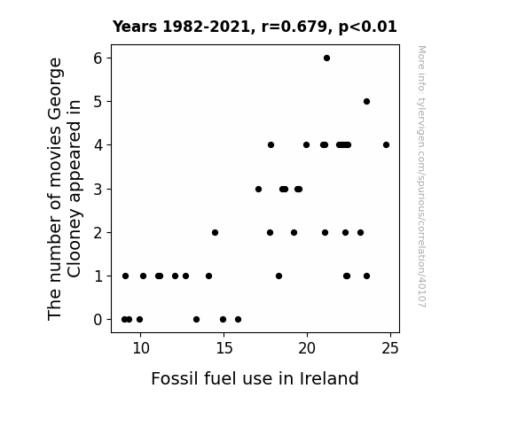 This means 46.1% of the change in the one variable (i.e., Fossil fuel use in Ireland) is predictable based on the change in the other (i.e., The number of movies George Clooney appeared in) over the 40 years from 1982 through 2021.