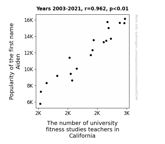 This means 92.6% of the change in the one variable (i.e., The number of university fitness studies teachers in California) is predictable based on the change in the other (i.e., Popularity of the first name Aiden) over the 19 years from 2003 through 2021.