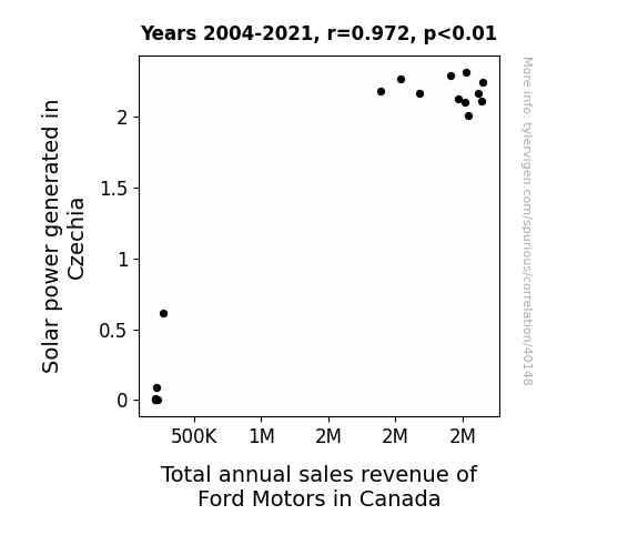 This means 94.5% of the change in the one variable (i.e., Total annual sales revenue of Ford Motors in Canada) is predictable based on the change in the other (i.e., Solar power generated in Czechia) over the 18 years from 2004 through 2021.