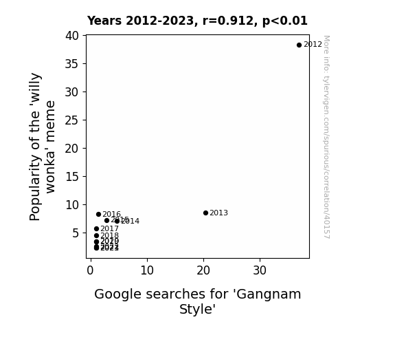 This means 83.2% of the change in the one variable (i.e., Google searches for 'Gangnam Style') is predictable based on the change in the other (i.e., Popularity of the 'willy wonka' meme) over the 12 years from 2012 through 2023.