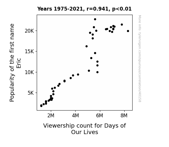 This means 88.5% of the change in the one variable (i.e., Viewership count for Days of Our Lives) is predictable based on the change in the other (i.e., Popularity of the first name Eric) over the 47 years from 1975 through 2021.