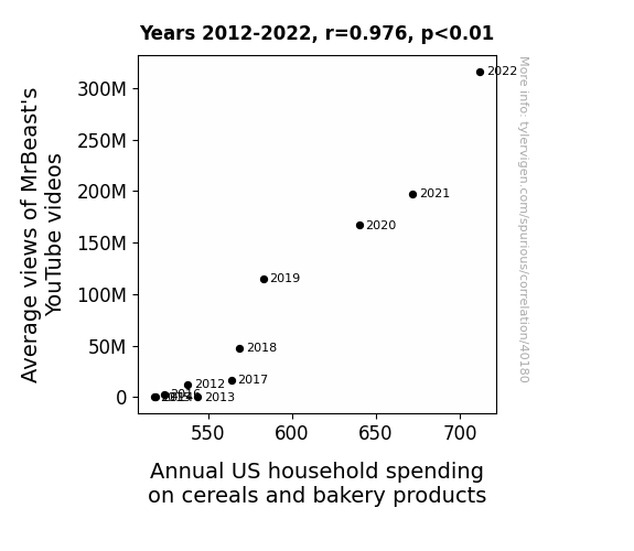 This means 95.2% of the change in the one variable (i.e., Annual US household spending on cereals and bakery products) is predictable based on the change in the other (i.e., Average views of MrBeast's YouTube videos) over the 11 years from 2012 through 2022.