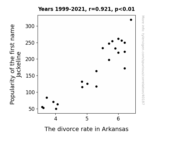 This means 84.8% of the change in the one variable (i.e., The divorce rate in Arkansas) is predictable based on the change in the other (i.e., Popularity of the first name Jackeline) over the 23 years from 1999 through 2021.