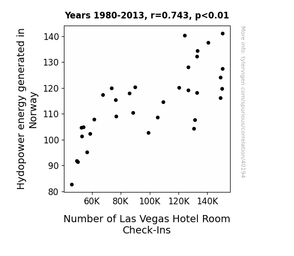 This means 55.2% of the change in the one variable (i.e., Number of Las Vegas Hotel Room Check-Ins) is predictable based on the change in the other (i.e., Hydopower energy generated in Norway) over the 34 years from 1980 through 2013.