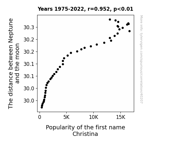This means 90.6% of the change in the one variable (i.e., Popularity of the first name Christina) is predictable based on the change in the other (i.e., The distance between Neptune and the moon) over the 48 years from 1975 through 2022.
