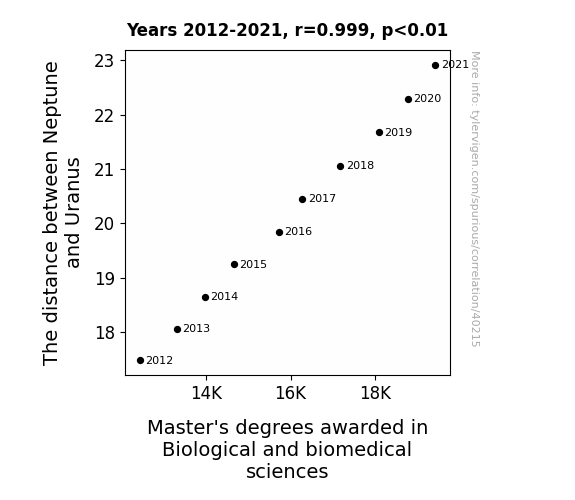 This means 99.8% of the change in the one variable (i.e., Master's degrees awarded in Biological and biomedical sciences) is predictable based on the change in the other (i.e., The distance between Neptune and Uranus) over the 10 years from 2012 through 2021.