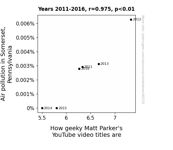 This means 95.1% of the change in the one variable (i.e., How geeky Matt Parker's YouTube video titles are) is predictable based on the change in the other (i.e., Air pollution in Somerset, Pennsylvania) over the 6 years from 2011 through 2016.