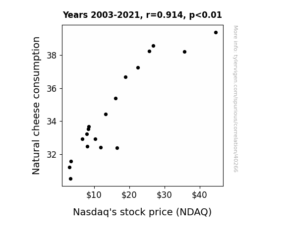 This means 83.6% of the change in the one variable (i.e., Nasdaq's stock price (NDAQ)) is predictable based on the change in the other (i.e., Natural cheese consumption) over the 19 years from 2003 through 2021.
