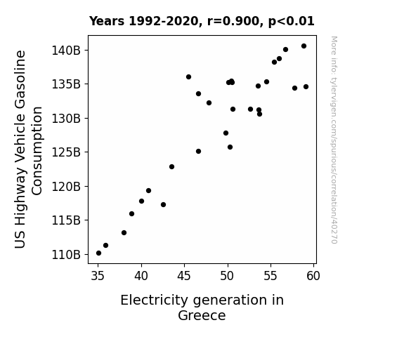 This means 81% of the change in the one variable (i.e., Electricity generation in Greece) is predictable based on the change in the other (i.e., US Highway Vehicle Gasoline Consumption) over the 29 years from 1992 through 2020.