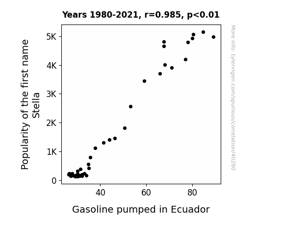 This means 97.1% of the change in the one variable (i.e., Gasoline pumped in Ecuador) is predictable based on the change in the other (i.e., Popularity of the first name Stella) over the 42 years from 1980 through 2021.