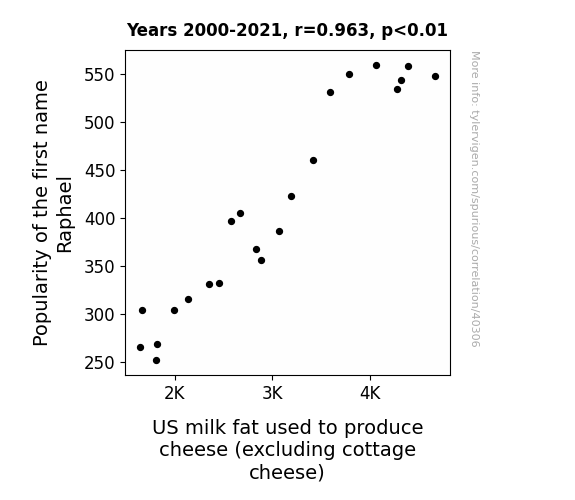 This means 92.8% of the change in the one variable (i.e., US milk fat used to produce cheese (excluding cottage cheese)) is predictable based on the change in the other (i.e., Popularity of the first name Raphael) over the 22 years from 2000 through 2021.