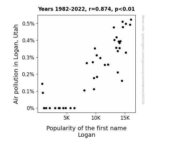 This means 76.3% of the change in the one variable (i.e., Popularity of the first name Logan) is predictable based on the change in the other (i.e., Air pollution in Logan, Utah) over the 41 years from 1982 through 2022.