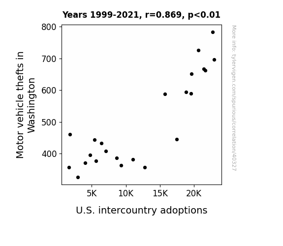 This means 75.6% of the change in the one variable (i.e., U.S. intercountry adoptions) is predictable based on the change in the other (i.e., Motor vehicle thefts in Washington) over the 23 years from 1999 through 2021.