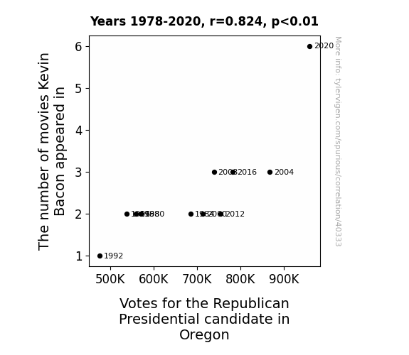 This means 67.9% of the change in the one variable (i.e., Votes for the Republican Presidential candidate in Oregon) is predictable based on the change in the other (i.e., The number of movies Kevin Bacon appeared in) over the 11 years from 1978 through 2020.