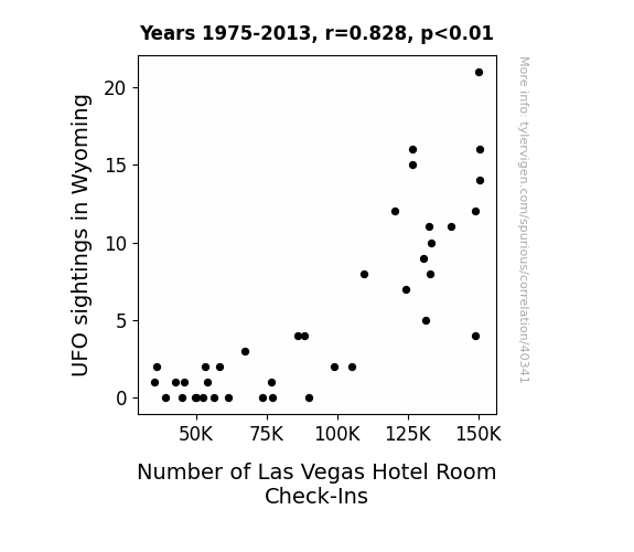 This means 68.6% of the change in the one variable (i.e., Number of Las Vegas Hotel Room Check-Ins) is predictable based on the change in the other (i.e., UFO sightings in Wyoming) over the 39 years from 1975 through 2013.