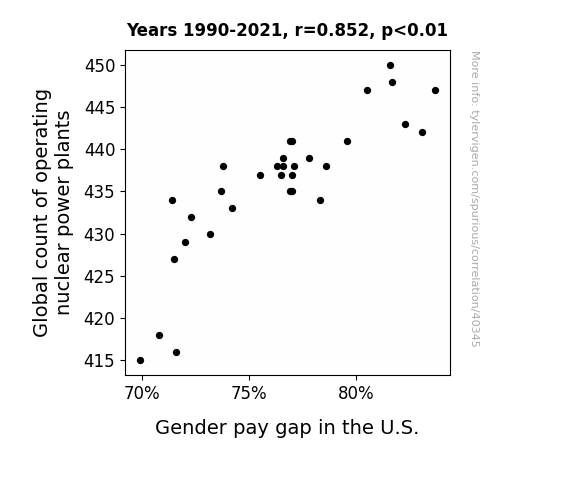 This means 72.6% of the change in the one variable (i.e., Gender pay gap in the U.S.) is predictable based on the change in the other (i.e., Global count of operating nuclear power plants) over the 32 years from 1990 through 2021.