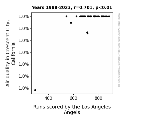 This means 49.1% of the change in the one variable (i.e., Runs scored by the Los Angeles Angels) is predictable based on the change in the other (i.e., Air quality in Crescent City, California) over the 36 years from 1988 through 2023.