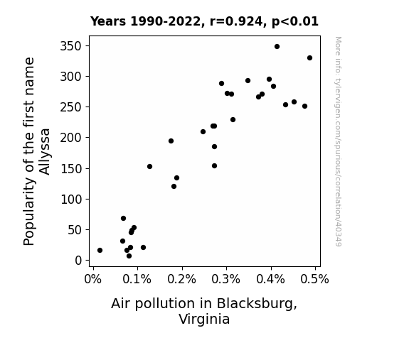 This means 85.3% of the change in the one variable (i.e., Air pollution in Blacksburg, Virginia) is predictable based on the change in the other (i.e., Popularity of the first name Allyssa) over the 33 years from 1990 through 2022.