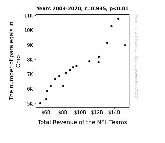 This means 87.4% of the change in the one variable (i.e., Total Revenue of the NFL Teams) is predictable based on the change in the other (i.e., The number of paralegals in Ohio) over the 18 years from 2003 through 2020.