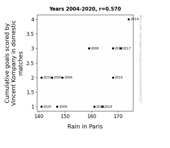 This means 32.5% of the change in the one variable (i.e., Rain in Paris) is predictable based on the change in the other (i.e., Cumulative goals scored by Vincent Kompany in domestic matches) over the 12 years from 2004 through 2020.