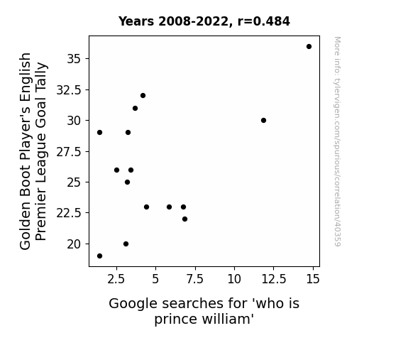 This means 23.4% of the change in the one variable (i.e., Google searches for 'who is prince william') is predictable based on the change in the other (i.e., Golden Boot Player's English Premier League Goal Tally) over the 15 years from 2008 through 2022.