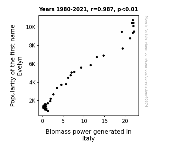 This means 97.5% of the change in the one variable (i.e., Biomass power generated in Italy) is predictable based on the change in the other (i.e., Popularity of the first name Evelyn) over the 42 years from 1980 through 2021.
