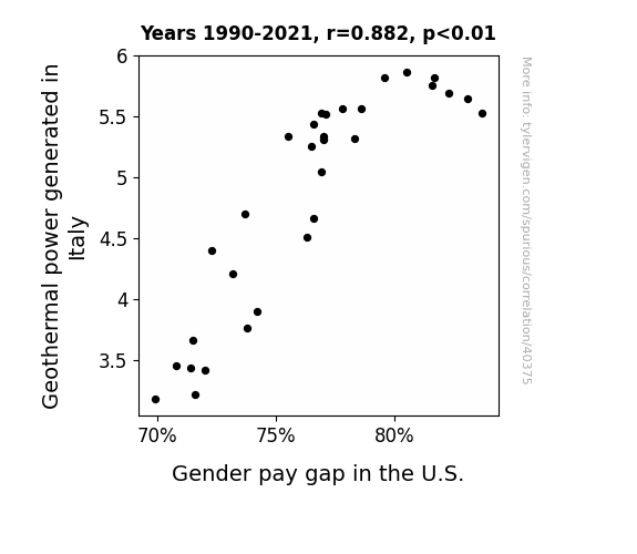 This means 77.7% of the change in the one variable (i.e., Gender pay gap in the U.S.) is predictable based on the change in the other (i.e., Geothermal power generated in Italy) over the 32 years from 1990 through 2021.