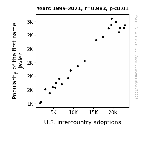 This means 96.7% of the change in the one variable (i.e., U.S. intercountry adoptions) is predictable based on the change in the other (i.e., Popularity of the first name Javier) over the 23 years from 1999 through 2021.