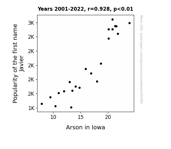 This means 86.1% of the change in the one variable (i.e., Arson in Iowa) is predictable based on the change in the other (i.e., Popularity of the first name Javier) over the 22 years from 2001 through 2022.