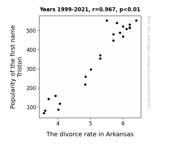This means 93.4% of the change in the one variable (i.e., The divorce rate in Arkansas) is predictable based on the change in the other (i.e., Popularity of the first name Triston) over the 23 years from 1999 through 2021.