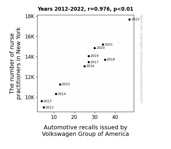 This means 95.2% of the change in the one variable (i.e., Automotive recalls issued by Volkswagen Group of America) is predictable based on the change in the other (i.e., The number of nurse practitioners in New York) over the 11 years from 2012 through 2022.