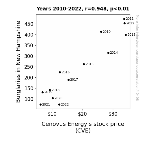 This means 89.8% of the change in the one variable (i.e., Cenovus Energy's stock price (CVE)) is predictable based on the change in the other (i.e., Burglaries in New Hampshire) over the 13 years from 2010 through 2022.